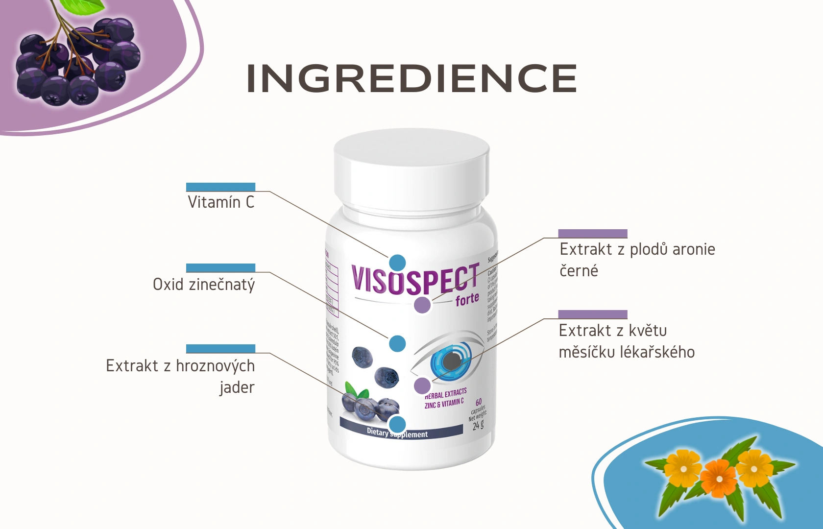 celuloza (substancja wypełniająca), żelatyna (składnik otoczki kapsułki), ekstrakt z owoców Aronii Czarnej (Aronia melanocarpa) , ekstrakt z kwiatów Nagietka Lekarskiego (Calendula officinalis) , Kwas L-Askorbinowy , Tlenek Cynku, ekstrakt z pestek Winorośli Właściwej (Vitis vinifera), sole magnezowe kwasów tłuszczowych (substancja przeciwzbrylająca), dwutlenek krzemu (substancja przeciwzbrylająca).